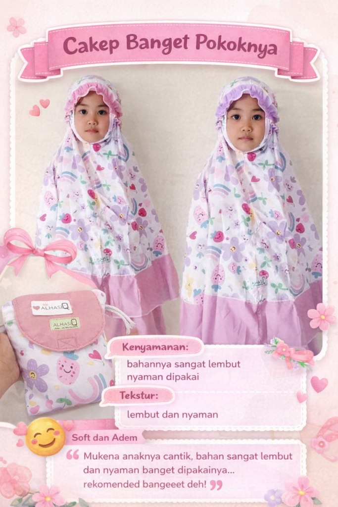 Material menggunakan Katun POLY Rayon Premium dikombinasikan dengan Katun Micro Import. Hasilnya? Mukena yang sangat lembut, adem di kulit, dan jatuh cantik saat digunakan.